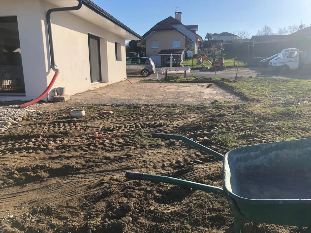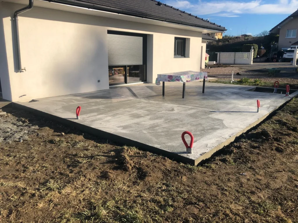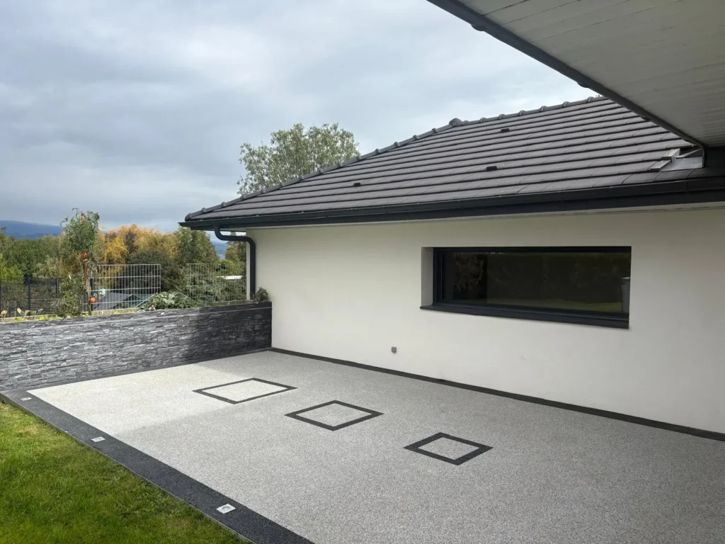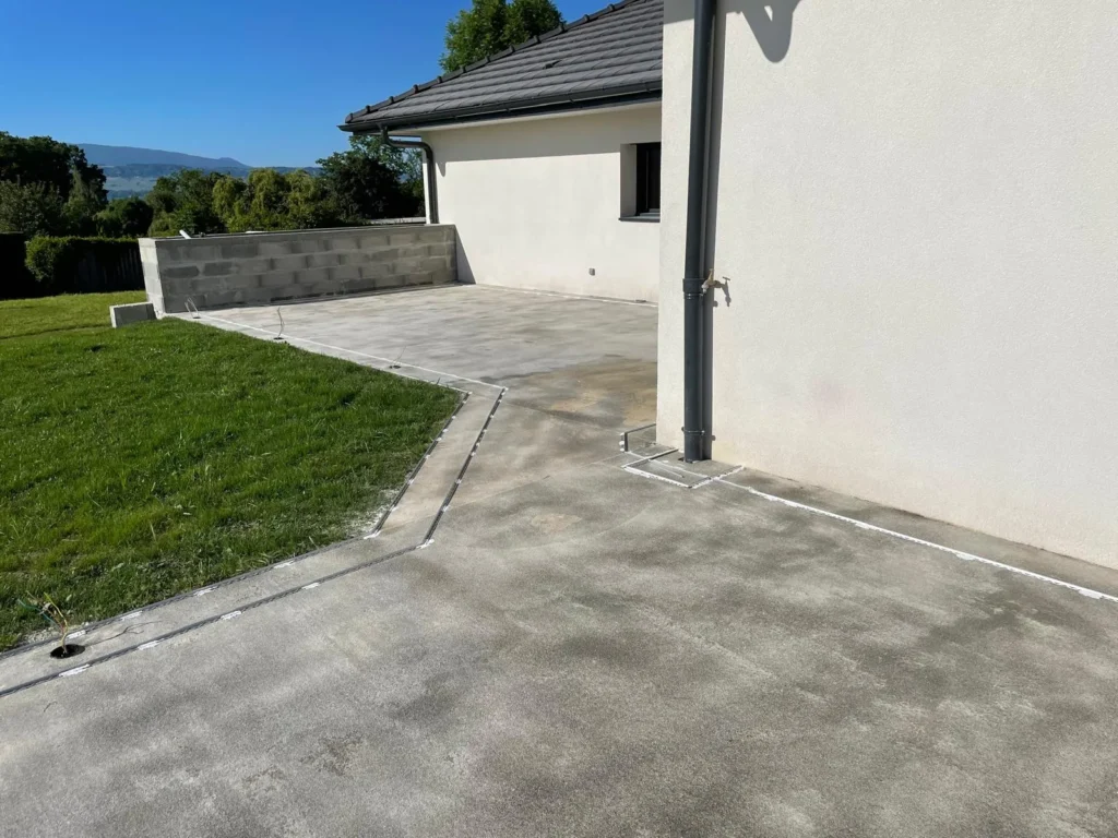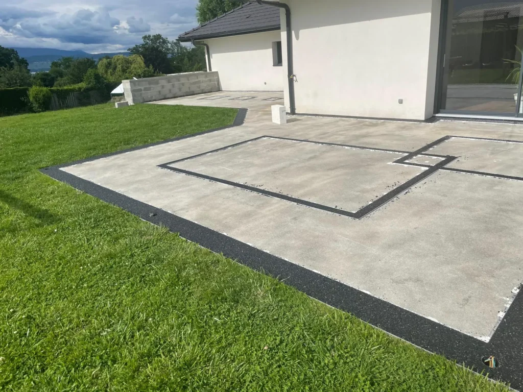 Réalisation d’une terrasse en moquette de pierre, alliant esthétisme et résistance. Après la préparation du terrain et le coulage de la dalle béton, la moquette de pierre a été appliquée pour offrir une surface moderne, antidérapante et durable. Cette finition met en valeur l’extérieur de la maison tout en apportant confort et élégance à l’espace de vie.